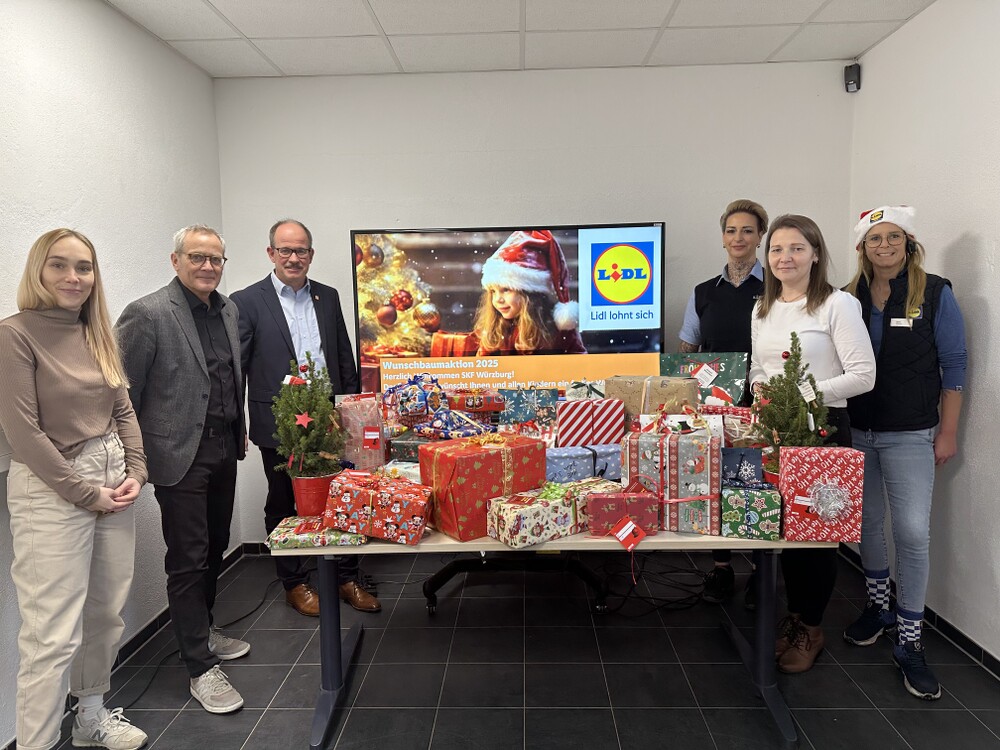 Kinderaugen an Weihnachten zum Leuchten bringen – dieses Ziel haben die Mitarbeiter:innen der Lidl-Region Erlensee. Sie erfüllen die Weihnachtswünsche von insgesamt 50 Kindern des Sozialdienst katholischer Frauen e.V. Würzburg im Rahmen der Wunschbaumaktion. Am 16. Dezember übergab Christin Wienholtz, Vertrauensperson der Lidl Vertriebs-GmbH & Co. KG in Erlensee, die Päckchen an Isabelle Hassemer, Dr. Norbert Beck und Wolfgang Meixner vom SkF Würzburg. Rechtzeitig zum Fest können die von den Lidl-Beschäftigten selbst verpackten Geschenke nun bei den Kindern unter dem Weihnachtsbaum liegen. „Wir freuen uns, die wertvolle Arbeit des SkF zu unterstützen und wünschen allen ein frohes Weihnachtsfest“, sagt Christin Wienholtz.