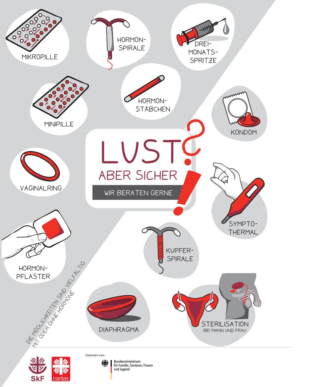 Um die Hemmschwelle, sich über diese Themen Informationen einzuholen, herabzusetzen, entwickelten die beiden Verbände ein Plakat. Es zeigt neben dem Appell an Ratsuchende eine Sammlung der gängigen Verhütungsmittel; diese sind in hormonelle (grau unterlegt) und nicht hormonelle Verhütungsmittel unterteilt.